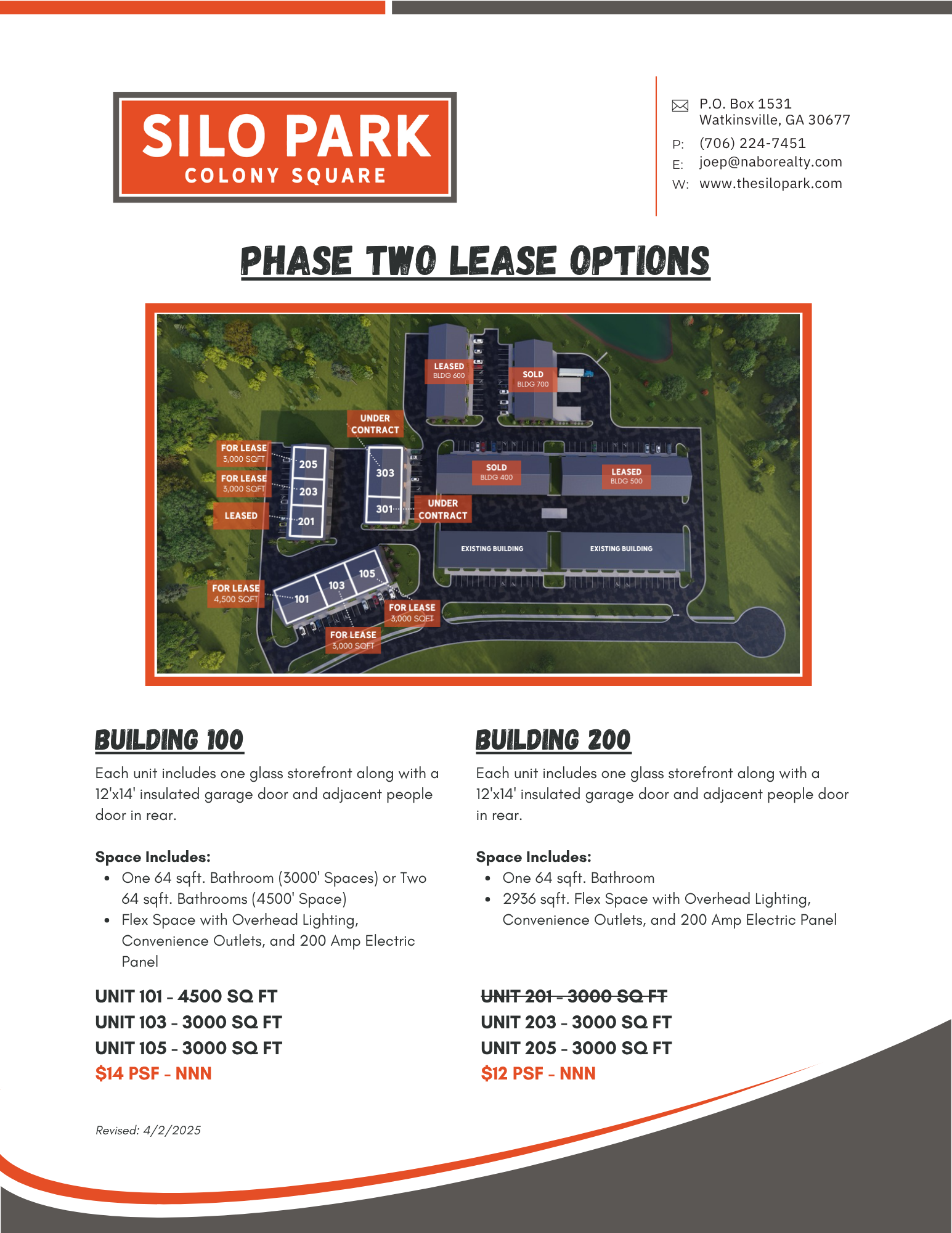 This is our final phase with 6 office/warehouse units, ranging from 3000’ to 4500’ individual units/storefronts, with the ability to combine for larger space needs.